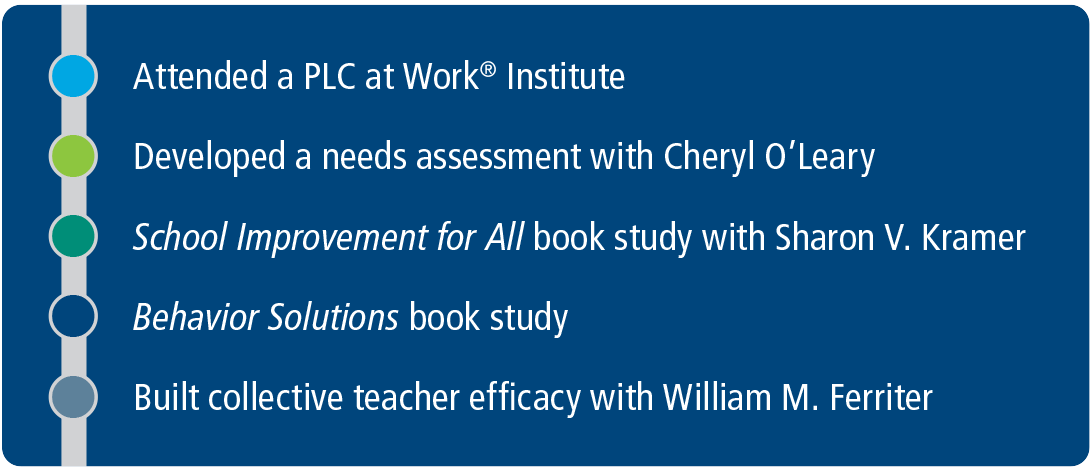 Office referrals dropped by 60% after utilizing the PLC at Work® and RTI at Work™ processes to increase student awareness and develop targeted behavioral intervention plans. The school built Tier 2 systems to support student behavior and used data to drive the process. Teachers now view discipline through the same four PLC questions used for academic learning.